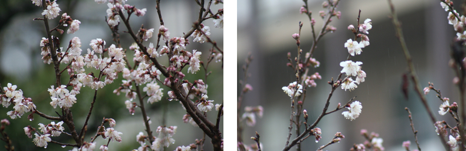 先週までは、白い梅の花が咲いていたのだが今週に入り、その梅の花を覆い被すように桜が咲き出した。