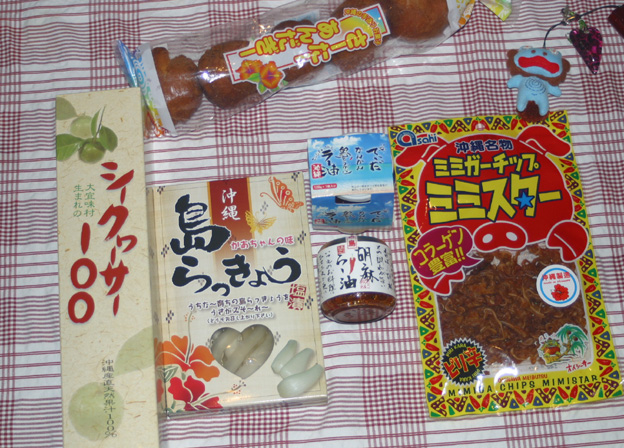チョコボが言葉にした、「シークワーサー」、「島らっきょ」、「ラー油」、「シーサーのキーホルダー」、「ミミガー」、「サータアンダギー」・・・・