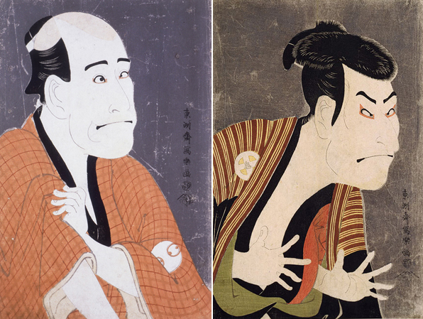しかし、先日NHKの「日曜美術館」という番組で写楽の描いた「初代尾上松助の松下酒造之進」と「三代目市川高麗蔵の志賀大七」の絵を取り上げ、口元の墨は、(病的な表現をしたい時には唇に特別な墨の塗り方をすると言う)舞台の隅に座って見ている能楽師では分からないだろう。みたいな事を言っていた。