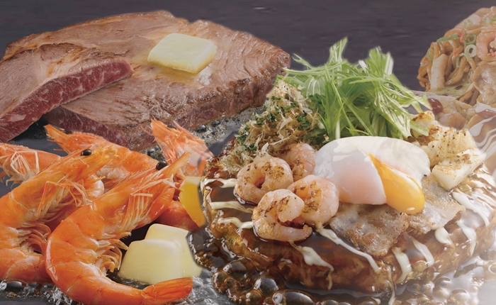 MIXお好みともんじゃ焼き、サイコロステーキ&ビール酎ハイ2杯。
