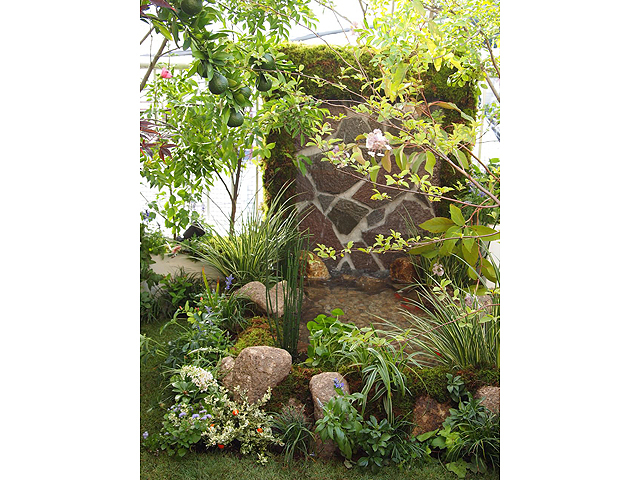 発泡スチロールに御影石を張り付けて行き、滝壺はプラ船。