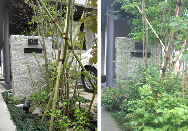 坪庭に植えた黒竹の新芽が伸びて来た。
