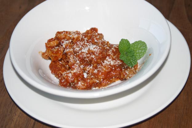 前回と違うのは、生のバジルがなかったので乾燥バジルを使った事と、仕上げたトマトソースに水を加え、数時間煮込んだハチソスを入れ、元の容量になるまで煮込んだ事。
