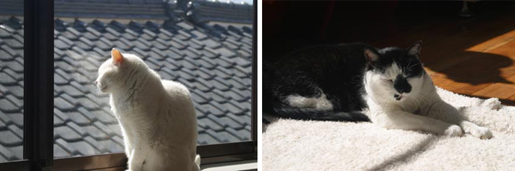 誰も居ない息子の部屋で日向ぼっこする「しろ」&「ぽん太」。