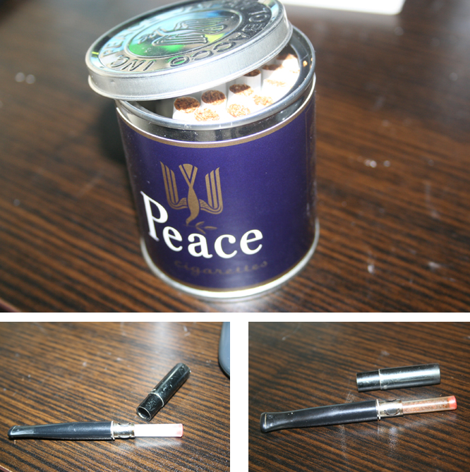タバコを缶から取り出し、吸い口の方を机などにトントンと叩き、吸い口の方を固くしてやる。