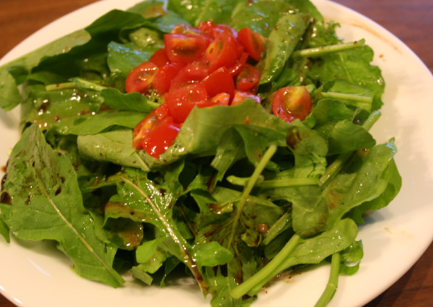 いつもは香草サラダの盛り合わせを作るのだが、今回はシンプルにルッコラとプチトマトのサラダ。
