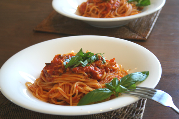 夜食なら、前菜と言う名のツマミを食べてからだからパスタの量も70g~80gなのだが、昼食でパスタの単品だったから2人前で230gも茹でてしまった。。