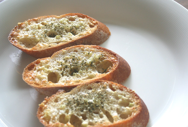 みじん切りにした(又は、摩り下ろした)ニンニクとバターを馴染ませておき、オリーブオイルで香り付けしたペーストをパンに塗るだけ。。(でもこれが美味しい!)