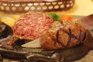 熱い鉄板の上の置かれたハンバーグは、そのうちにミディアムレアーに焼かれる。