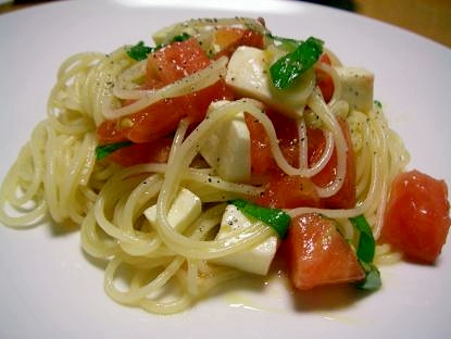 トマト、モッツアレラチーズ、バジル、ニンニクスライス、これに粗挽きコショウと塩で味付けし、オリーブオイル、レモンで調整する。