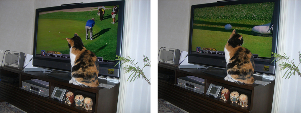 他の猫は知らん振りなのに、この「アンコ」はテレビの中のゴルフボールが気になるようだ。