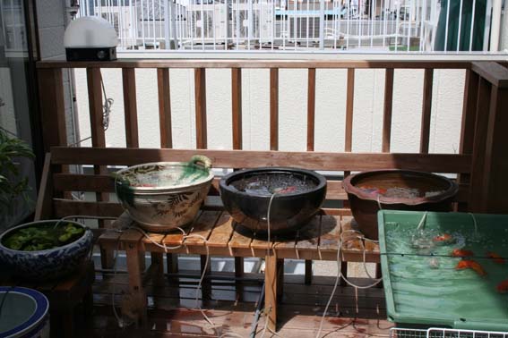 今まで新築のベランダに並んでいた金魚の水槽をここへ移した。