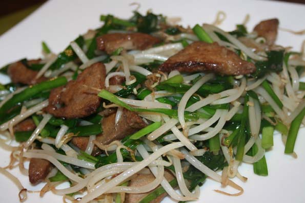 レバーを醤油、酒、片栗粉、塩コショウで味付けし、炒める前にサッと油通しする。