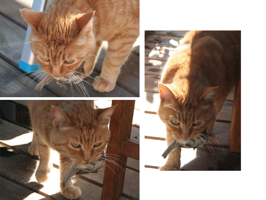 我が家の猫達のうち、この「アンコ親子」と「チィー」がネズミやらコウモリやトカゲを捕って来る。 但し「チィー」は、それをオモチャとして捕って来るようで飽きると知らんぷりである。
