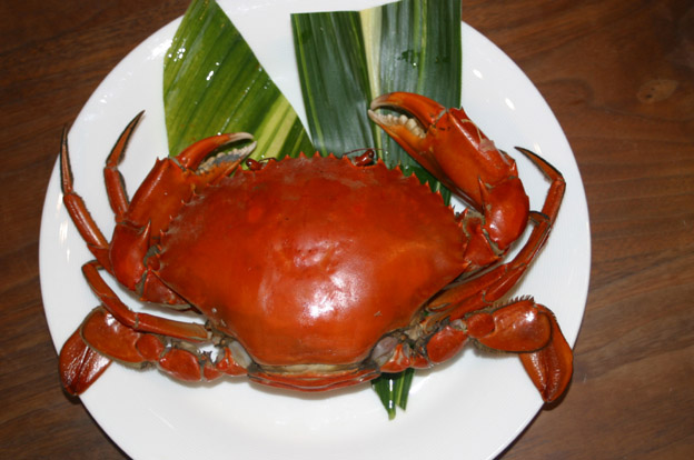 普段、活きた蟹は、フンドシと呼ばれる腹の部分から櫛を刺して〆てからその部分に粗塩を振って蒸す。