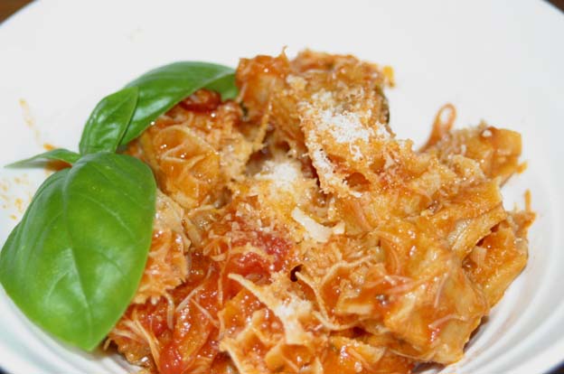 トマトペースト&ホールトマトで味付けしたソースに絡めパルミジャーノチーズをたっぷりかけ出来上がり。