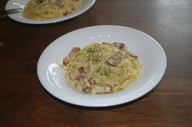 ところで『カルボナーラ』の意味はイタリア語で『炭焼き人風』とのこと。つまり黒コショーが炭を意味してるというわけです。ですから黒コショーは必須ですし、ベーコンの焦げで見た目が悪くなってもいいわけです。