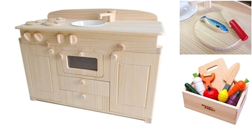 誕生日プレゼントに買ってあげた木製キッチンセットで楽しそうに遊んでいる。