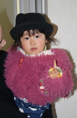 帰り掛け、お局に抱かれて、玄関先で「はいポーズ!ピースは?」と聞くと、小さな指を折って、ピースサインをした。