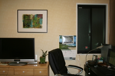 この左手にベッドがある。そして、その上にクーラーがある。大きさは大きくはないが、200Vのクーラー。