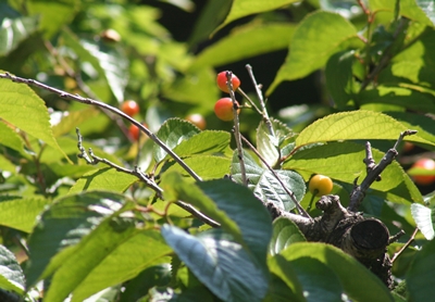 隣家の庭にある早咲きの桜にサクランボが成っていた。